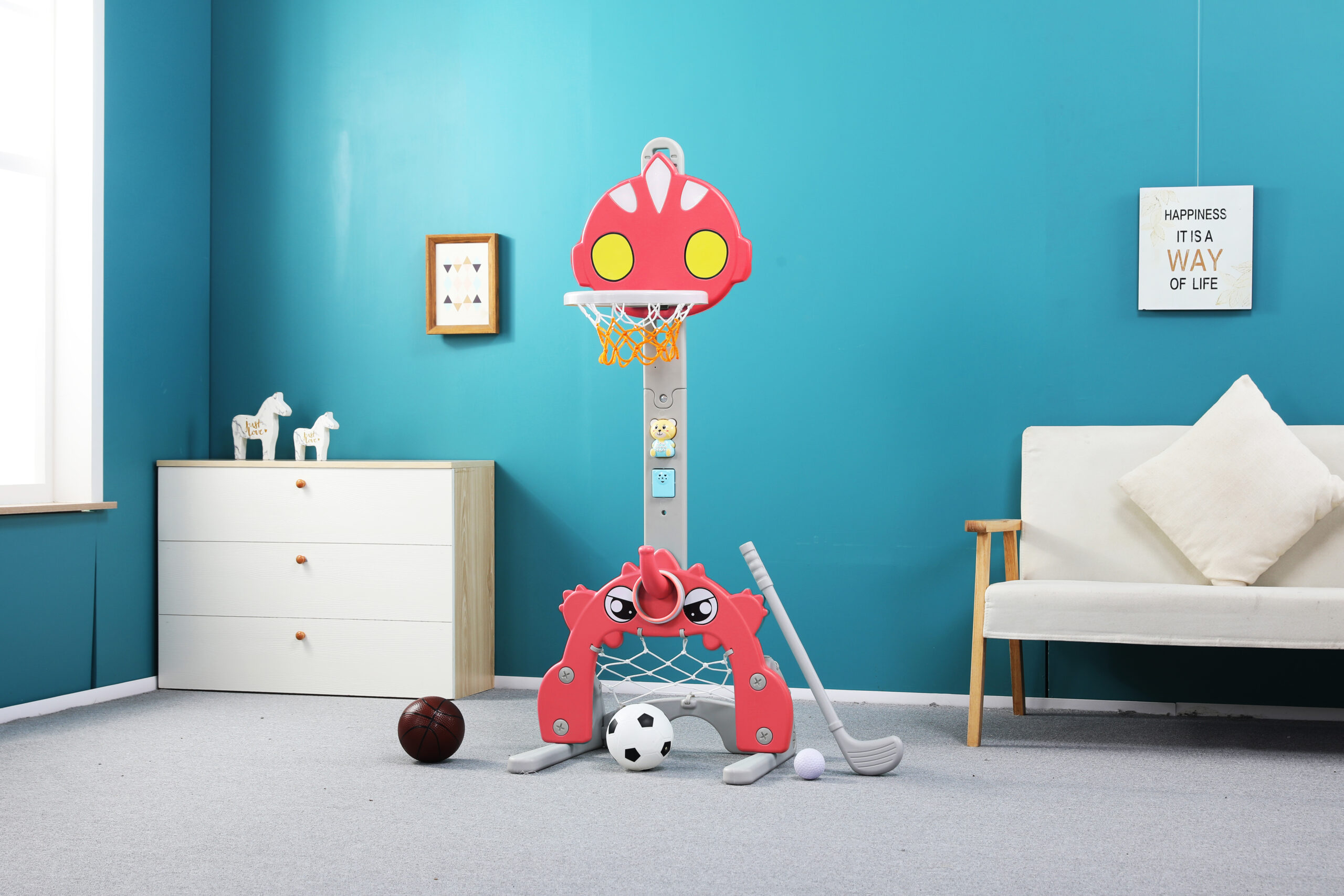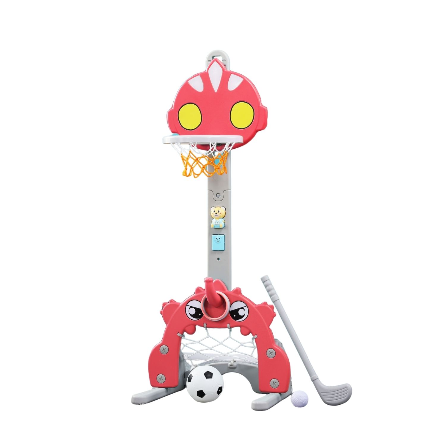 • 4-in-1 Activity Center — This kids basketball hoop has five sports to play, ring toss, basketball game, golf game and soccer goal game. It also comes with 1 basketball, 1 soccer ball, 4 rings, 1 pump, 1 golf ball and golf club. Kids will enjoy great fun playing with it!